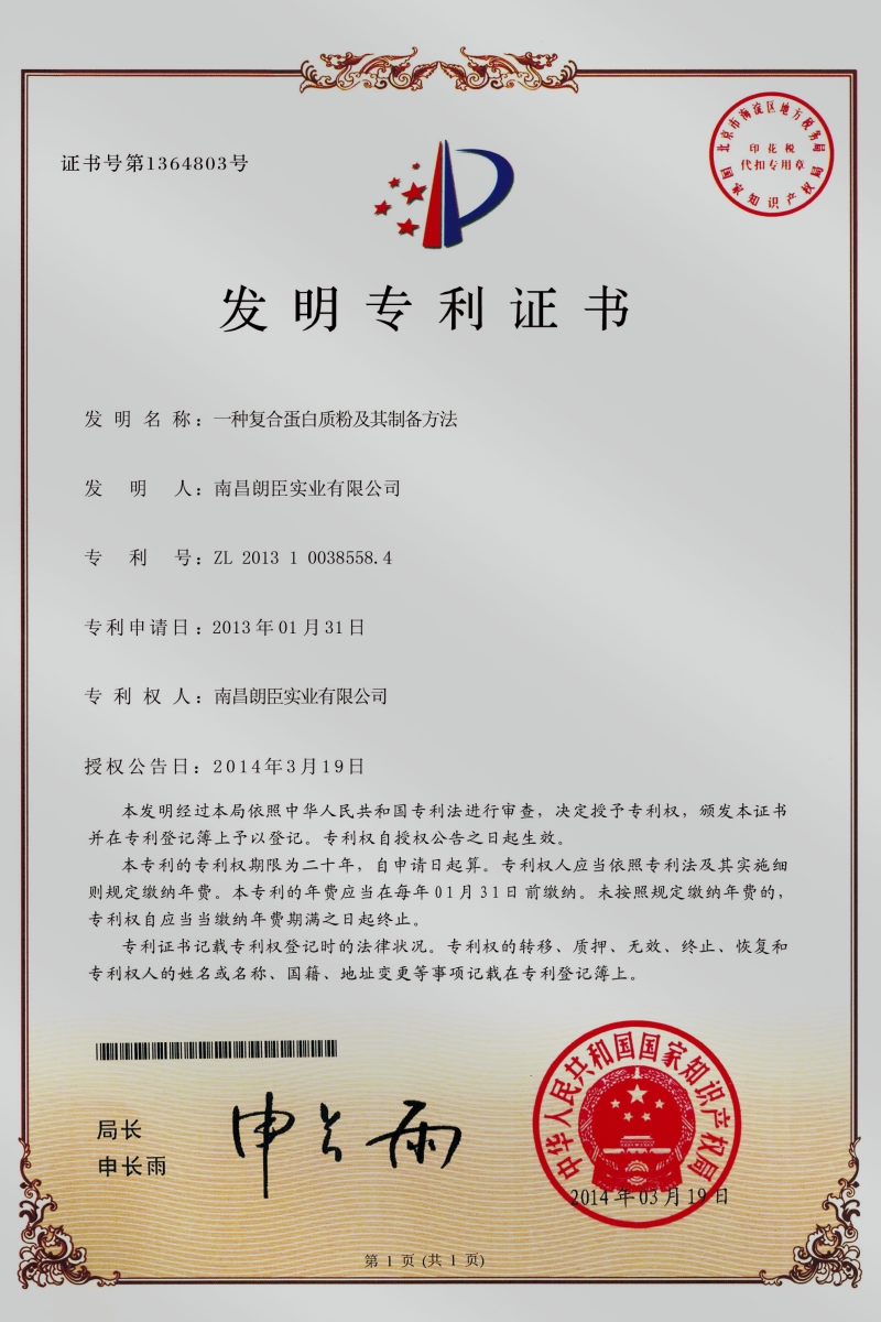 2013年3月19日,南昌朗臣實業研發團隊在國(guó)内率先發(fā)明出一種适合母嬰特殊群體适用的複合蛋白粉,填補(bǔ)瞭(le)國内母嬰群體對蛋白粉補(bǔ)充的需求。